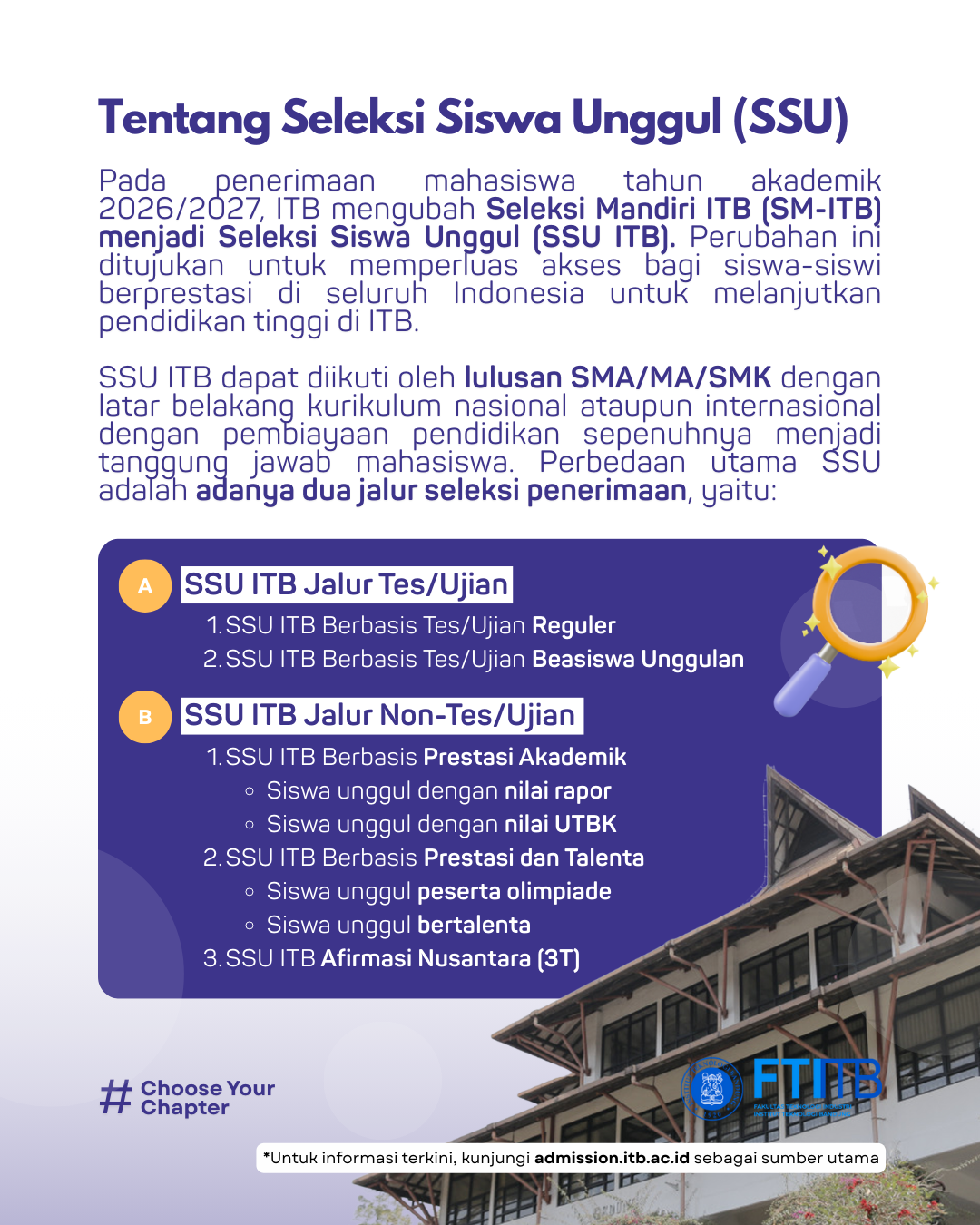 Ingin lebih tau tentang Informasi Pendaftaran Seleksi Siswa Unggul (SSU) dan International Undergraduate Program (IUP) di FTI ITB? yuk simak informasinya..📢