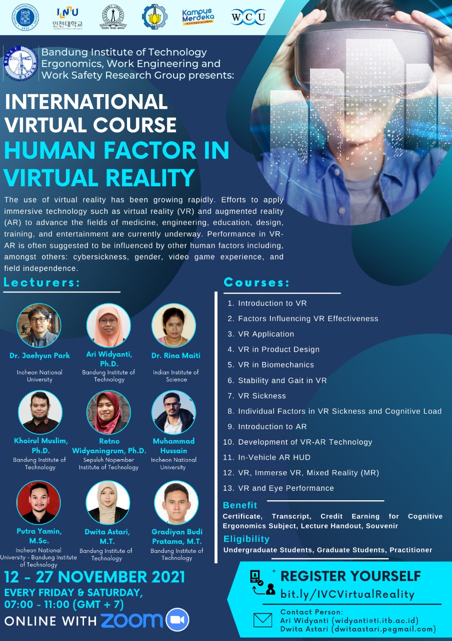 ? Kelompok Keahlian Rekayasa Sistem Kerja dan Ergonomi Teknik Industri ITB bekerja sama dengan Incheon National University dan Indian Institute of Science dalam mengadakan International Virtual Course: Human Factor in Virtual Reality.