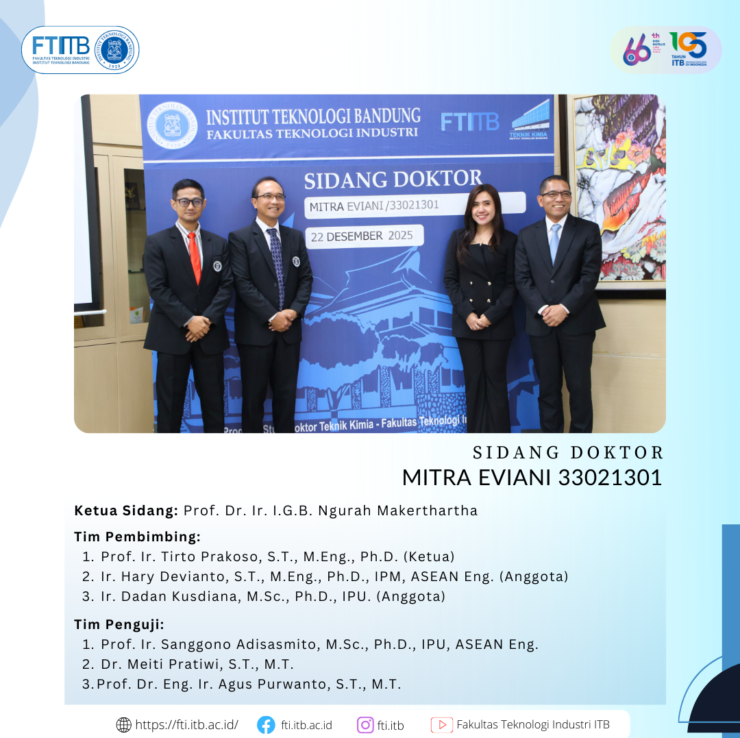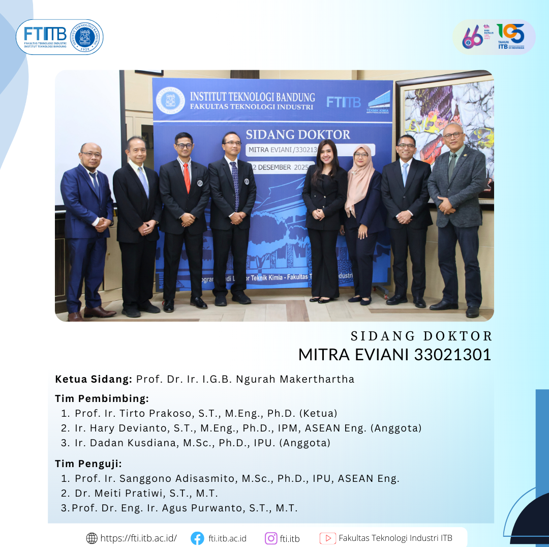 Selamat atas sidang pendidikan Program Doktor FTI-ITB Posted: December 24, 2025 By: Admin Category: Akademik / Berita / featured Selamat kepada Dr. Mitra Eviani yang telah berhasil menyelesaikan pendidikan program doktor di Program Studi Doktor Teknik Kimia FTI-ITB. Share Previous Post PRIMA ITB dan ITB CEO Summit 2025 Next Post Pelatihan Transisi Energi dan Dekarbonisasi pada Pembangkitan Listrik