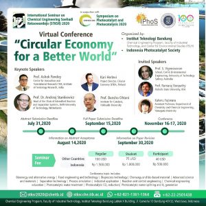 International Seminar on Chemical Engineering Soehadi Reksowardojo (STKSR) is an annual seminar held by the Department of Chemical Engineering ITB in honor of Prof. Soehadi Reksowardojo’s contribution to the early developments of chemical engineering higher education in Indonesia. This year STKSR 2020 will be held in conjunction with Symposium on Photocatalyst and Photocatalysis ( Symphosis ) 2020 by virtual conference, starting from November 16th to November 17th, 2020. Bringing forward the theme “Circular Economy for a Better World”, we would like to invite scholars and practitioners from all around the world to contribute to these seminars.