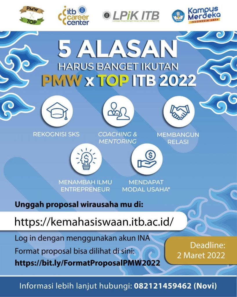 realisasikan bisnis kalian menjadi nyata. Ikuti Program Mahasiswa Wirausaha (PMWXTOP) ITB 2022. Program ini kolaborasi antara ITB Career Center dan LPIK ITB.