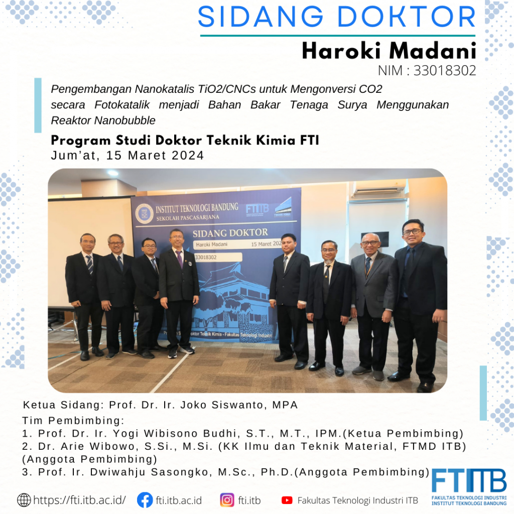 Selamat atas sidang pendidikan Program Doktor FTI-ITB Posted: Maret 20, 2024 By: Admin Category: Akademik / Berita / featured Selamat kepada Dr. Haroki Madani yang telah berhasil menyelesaikan pendidikan program doktor di Program Studi Doktor Teknik Kimia FTI-ITB. Share Previous Post Kilang Pertamina Internasional Career Talks “Energizing Future Talent 2024” Next Post Selamat atas sidang pendidikan Program Doktor FTI-ITB