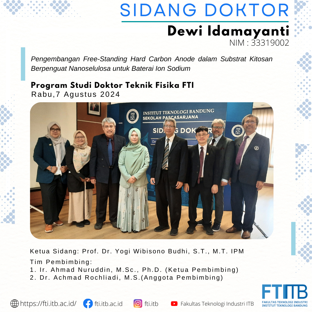Selamat atas sidang pendidikan Program Doktor FTI-ITB Posted: August 9, 2024 By: Admin Category: Akademik / Berita / featured Selamat kepada Dr. Dewi Idamayanti yang telah berhasil menyelesaikan pendidikan program doktor di Program Studi Doktor Teknik Fisika FTI-ITB. Share Previous Post Selamat atas sidang pendidikan Program Doktor FTI-ITB Next Post Guest Lecture – University of Groningen visiting FTI ITB