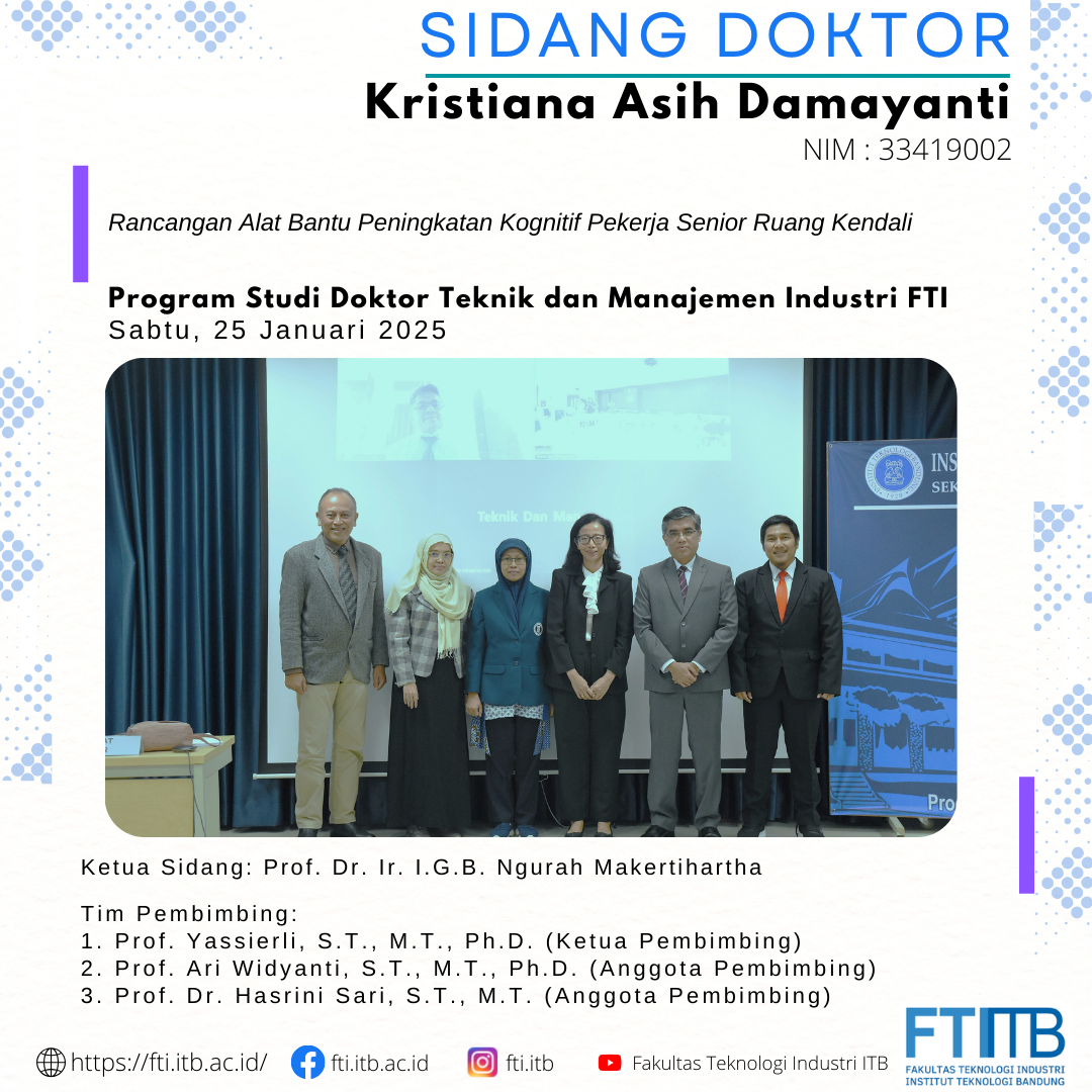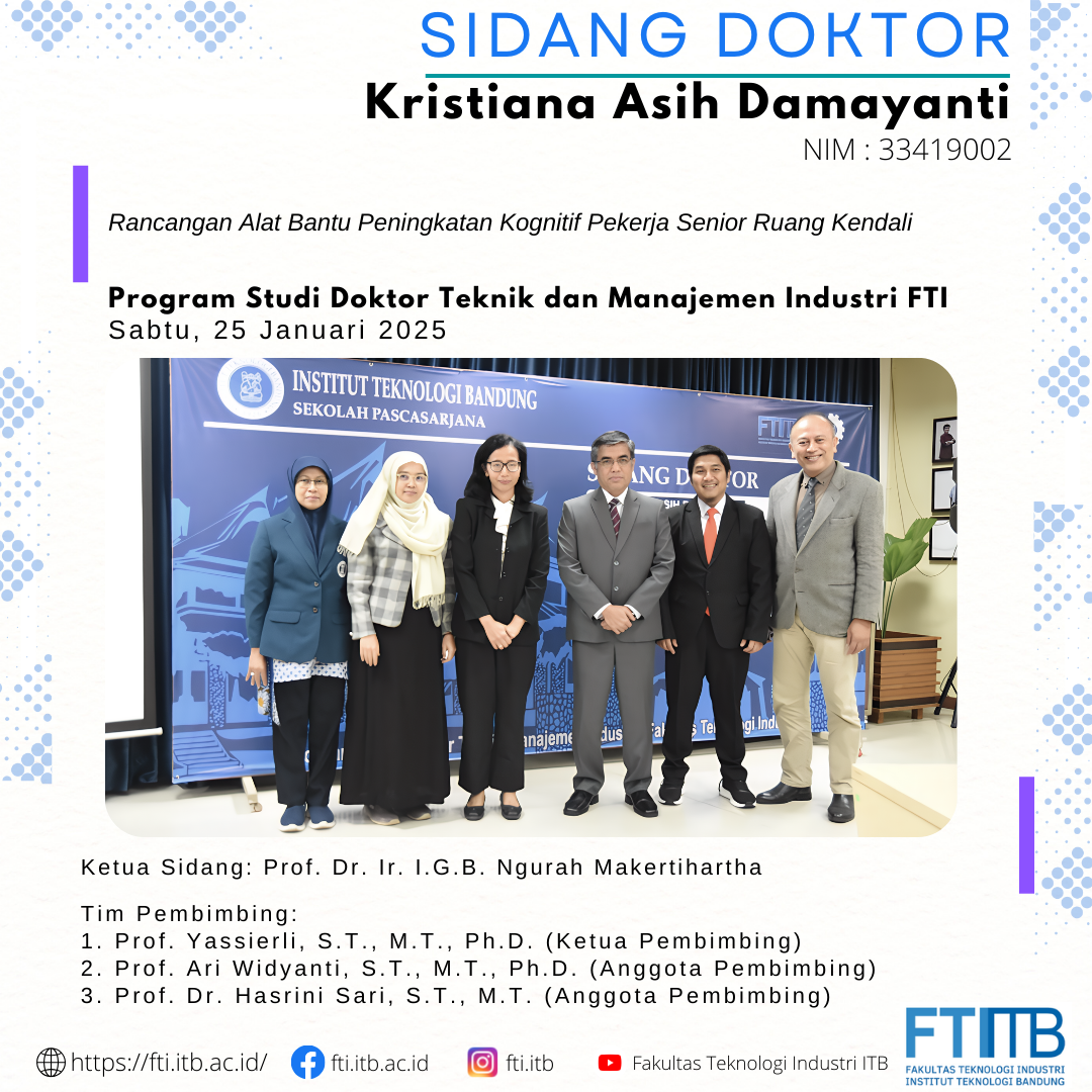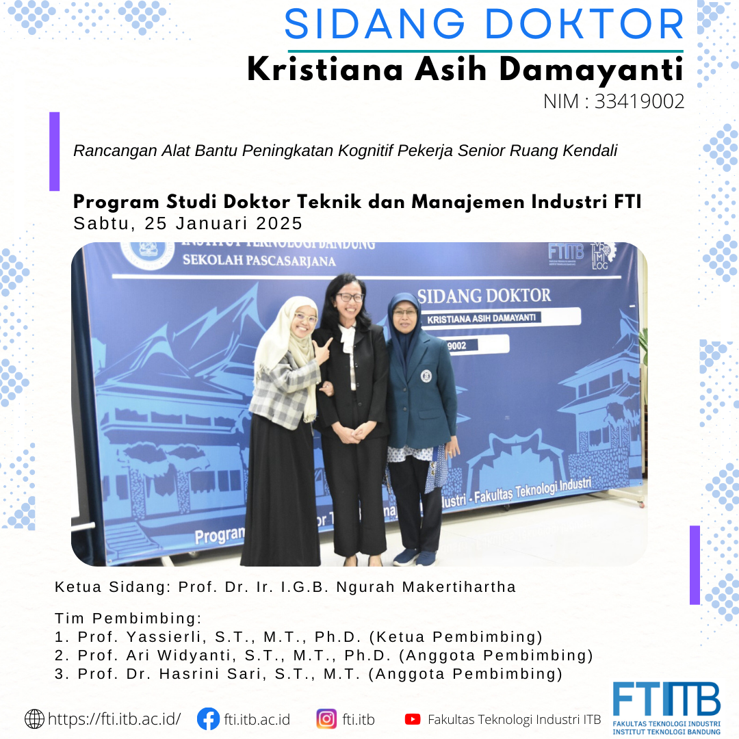 Selamat atas sidang pendidikan Program Doktor FTI-ITB Posted: February 10, 2025 By: Admin Category: Akademik / Berita / featured Selamat kepada Dr. Kristiana Asih Damayanti yang telah berhasil menyelesaikan pendidikan program doktor di Program Studi Teknik dan Manajemen Industri FTI-ITB. Share Previous Post OPEN HOUSE PROGRAM STUDI SARJANA DAN PASCASARJANA FTI 2025 Next Post Selamat atas sidang pendidikan Program Doktor FTI-ITB