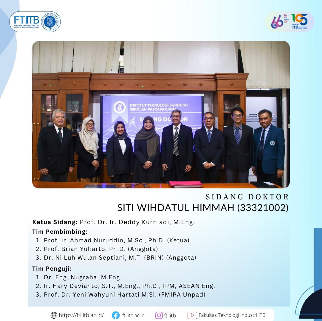 Selamat atas sidang pendidikan Program Doktor FTI-ITB Posted: Agustus 14, 2025 By: Admin Category: Akademik / Berita / featured Selamat kepada Dr. Siti Wihdatul Himmah yang telah berhasil menyelesaikan pendidikan program doktor di Program Studi Doktor Teknik Fisika FTI-ITB. Share Previous Post Rapat Koordinasi Pembangunan Zona Integritas FTI ITB Next Post Selamat atas sidang pendidikan Program Doktor FTI-ITB