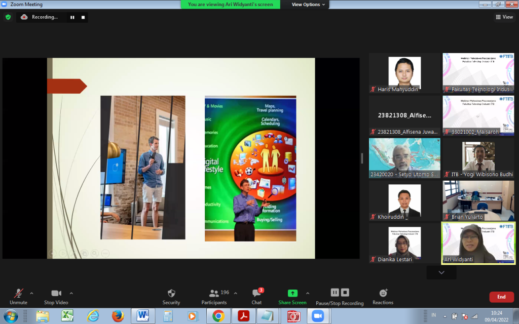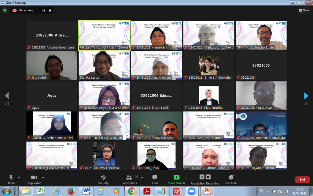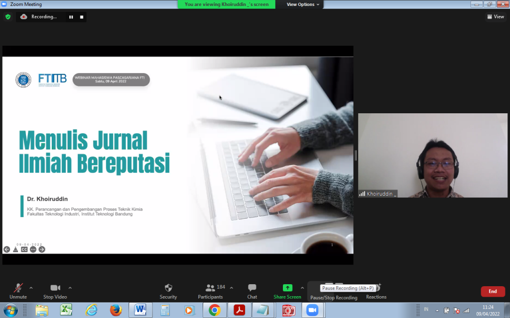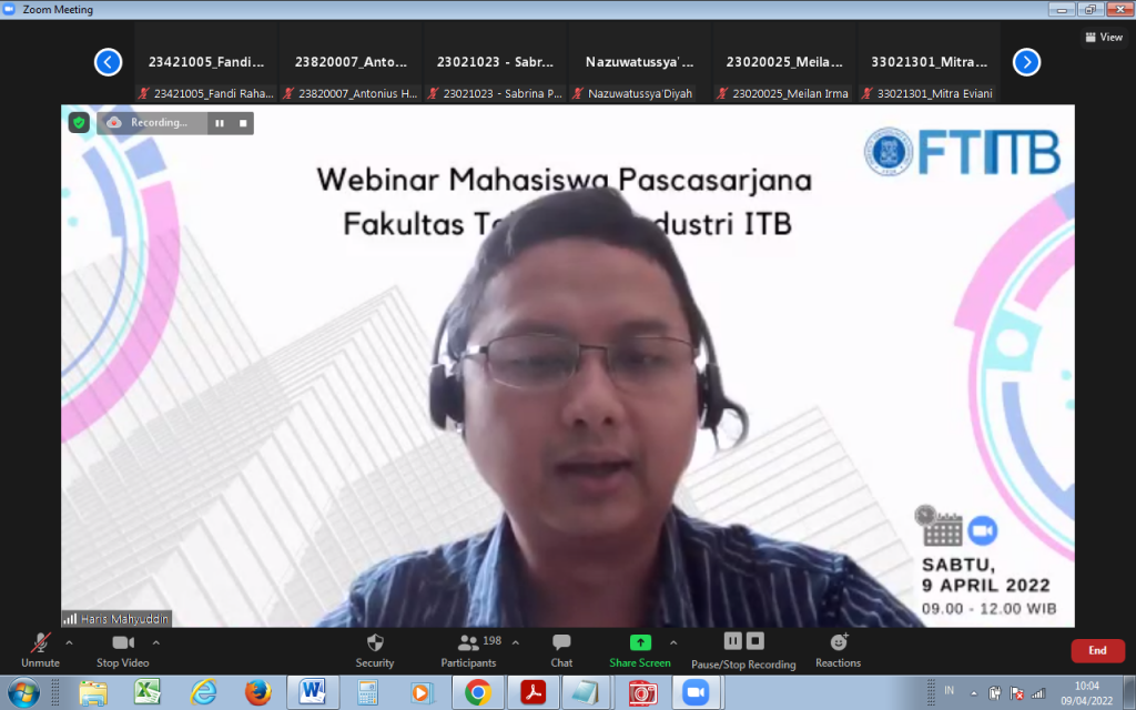 9 April 2022, Fakultas Teknologi Industri Institut Teknologi Bandung (FTI ITB)menyelenggarakan acara Webinar Mahasiswa Pascasarjana FTI secara daring melalui zoom meeting. Acara dimulai dengan sambutan dari Dekan FTI, Prof. Brian Yuliarto, Ph.D. yang menyambut baik terselenggaranya webinar ini dan berharap tambahan informasi semakin memberikan semangat mahasiswa pascasarjana FTI lebih meningkatkan kemampuan menulis serta kualitas tesis dan disertasi yang bereputasi Internasional.