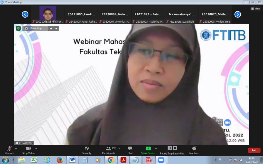 Dipandu oleh Dr. Dianika Lestari sebagai pembawa acara sekaligus moderator para narasumber webinar ini diantaranya adalah Dr. M. Haris Mahyuddin dengan tema “Teknik Menulis Laporan Tugas Akhir” kemudian dilanjutkan oleh Dr. Ari Widyanti menyampaikan tema “Teknik Presentasi Lisan” dan pembicara ketiga adalah Dr. Khoiruddin dengan tema “Menulis Jurnal Ilmiah Bereputasi”. Webinar ini diikuti 200 peserta dari berbagai program studi di lingkungan FTI ITB.