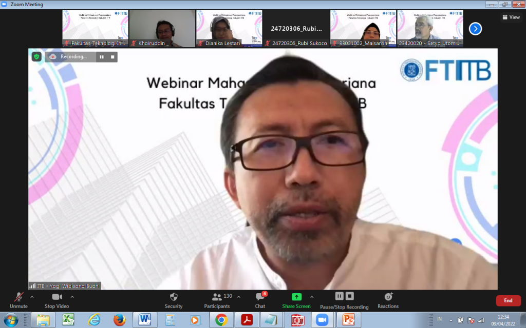 Sambutan selanjutnya oleh Wakil Dekan bidang Akademik FTI, Prof. Dr. Yogi Wibisono Budhi, yang juga menyambut dengan antusias adanya webinar pascasarjana FTI ini, tentunya harapannya dengan adanya webinar ini dapat menambah wawasan mahasiswa pascasarjana FTI tentang informasi tips dan trik seputar tesis dan disertasi.